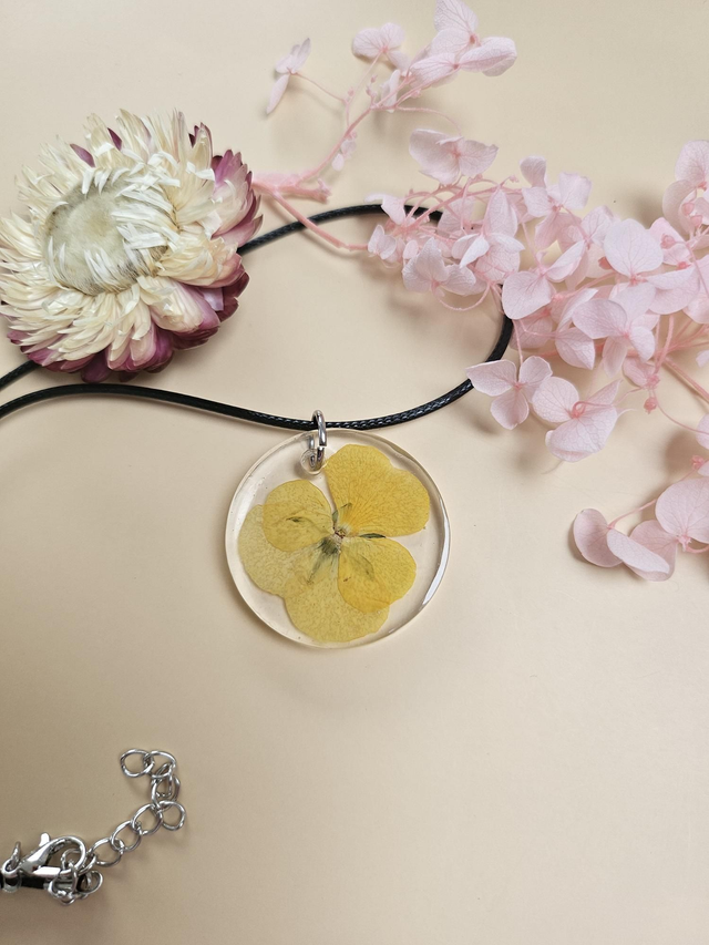 La forme ronde est en résine transparente translucide et incrustée d'une fleur jaune.