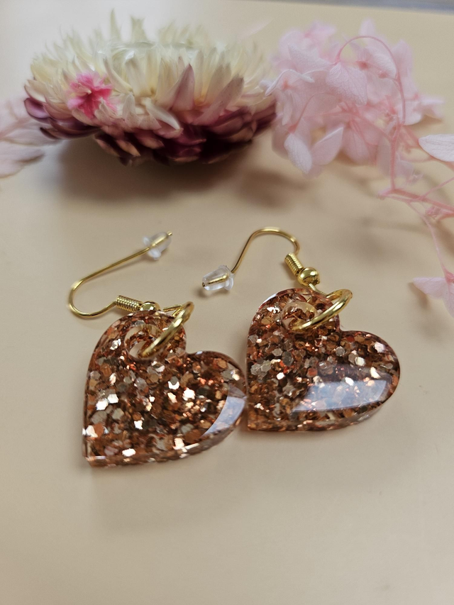 Boucles d'oreilles en résine - Cœurs penchés pailletés roses